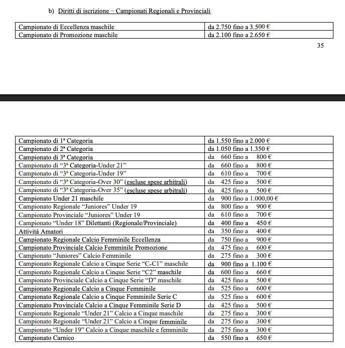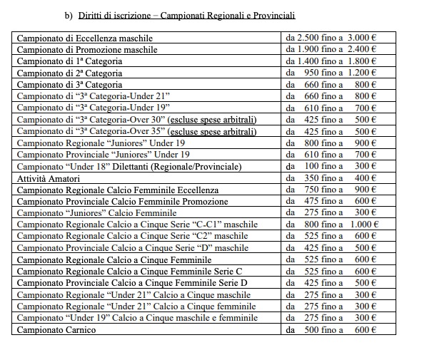 E non si salva nemmeno il calcio giovanile. Il campionato regionale Juniores Under 19, ad esempio, sale da 800 a 900 euro. Il campionato provinciale Juniores Under 19 da 500-700 a 610-700 euro. Un rincaro mascherato, perché il minimo aumenta mentre il massimo resta fermo, ma che nella pratica si traduce in un aumento reale e generalizzato.