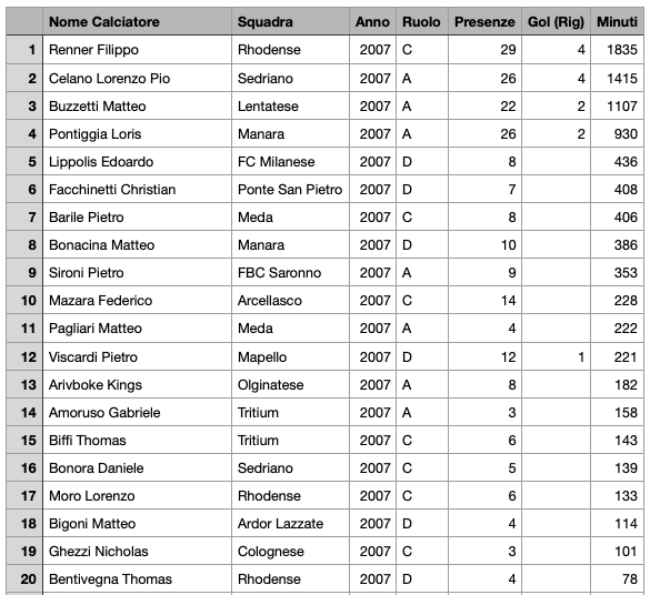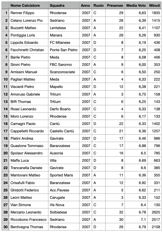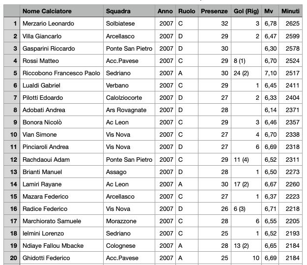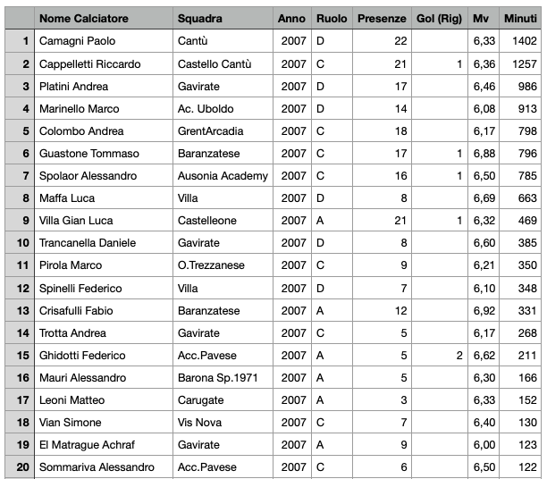 Schema dell'analisi? Si parte dai 2007 più impiegati nella categoria principe in ottica Rappresentativa, ovvero l'Eccellenza. Lei che ogni stagione consegna l'ossatura principale della rosa di partenza del Torneo delle Regioni, anzi, la quasi totalità. Da dove partire dunque? Da chi ha giocato più minuti in categoria, di seguito dunque ecco una Top 20 (il massimo dei giocatori convocabili dalla Rapp) dei gironi A e B escludendo i primi due classificati Jacopo Torre, terzino del Casteggio trasferitosi alla Valenzana (Piemonte), e Riccardo Crotti, difensore della Manara andato in Serie D alla Casatese Merate.