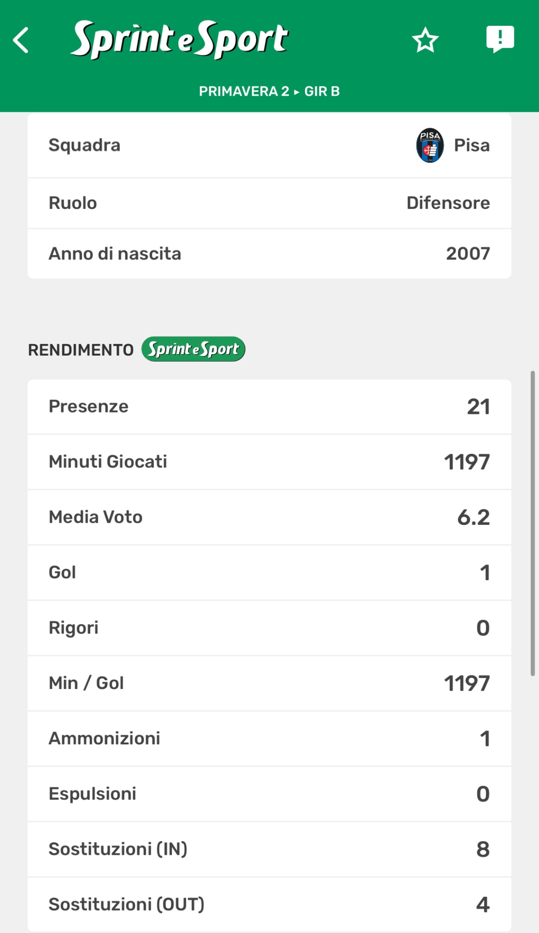 Il rendimento di Pucci nel campionato di Primavera 2. Per tutte le statistiche sulla Primavera 2 clicca sull'immagine e scarica gratuitamente l'app di Sprint e Sport.