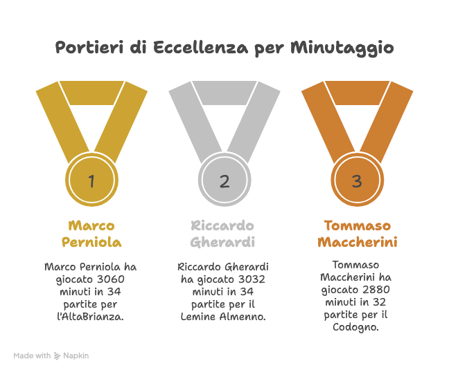 Il più presente è stato Marco Perniola dell'AltaBrianza, con 3060 minuti spalmati su 34 partite. È stato una vera roccia per i suoi: sempre affidabile, preciso, capace di offrire sicurezza e leadership. A parità di presenze, Riccardo Gherardi, numero uno del Lemine Almenno, con 3032 minuti giocati in 34 gare. Sul terzo gradino del podio c’è Tommaso Maccherini del Codogno: 2880 minuti in 32 match, a cui si aggiungono ben 11 gare concluse senza subire reti. La loro continuità ha rappresentato per i rispettivi club un valore inestimabile.
