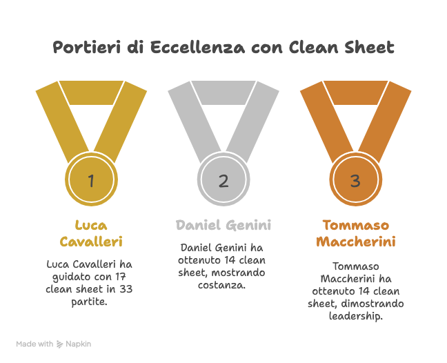 Il migliore in questa speciale graduatoria è Luca Cavalleri della Solbiatese, che ha chiuso 17 partite su 33 senza subire gol. Un dato straordinario, che racconta di una stagione vissuta da autentico baluardo difensivo. Alle sue spalle si posizionano due portieri che hanno condiviso lo stesso dato: Daniel Genini del Mapello e Tommaso Maccherini del Codogno, entrambi capaci di raggiungere quota 14 clean sheet. Hanno mostrato concentrazione, riflessi e capacità di leadership, contribuendo in maniera netta al rendimento delle loro squadre. Se Cavalleri ha impressionato per frequenza di imbattibilità, Genini e Maccherini hanno confermato che la costanza paga.