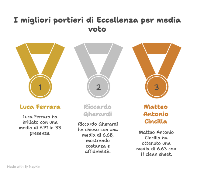 Il migliore, secondo le valutazioni settimanali, è stato Luca Ferrara della Sestese, con una media di 6.71 in 33 presenze. Non solo ha brillato per continuità, ma anche per impatto tecnico: le sue prestazioni sono state costantemente sopra la media. Appena dietro, ancora una volta, troviamo Riccardo Gherardi, che ha chiuso la stagione con una media di 6.68. La sua completezza emerge con forza: sempre presente, spesso decisivo, costantemente sopra il 6.5 in pagella. Anche Matteo Antonio Cincilla, portiere del Pavia, ha fatto registrare una stagione di altissimo profilo: media voto 6.63, 31 presenze e ben 11 partite senza gol subiti. Non è stato solo uno dei più apprezzati, ma anche uno dei più decisivi. Tra gli altri, vanno segnalati Ragone della Base 96 e Todesco del FBC Saronno, entrambi con voti sempre oltre il 6.5 e prestazioni molto solide. Unendo i dati relativi a presenze, clean sheet, rapporto percentuale di imbattibilità e media voto, si può stilare una classifica che premia i portieri più completi della stagione.