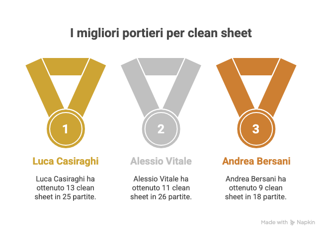 In cima a questa speciale classifica si piazza Luca Casiraghi del Pozzuolo, autentico protagonista della stagione con ben 13 clean sheet su 25 presenze, numeri che testimoniano la sua capacità di gestire la pressione e blindare la porta con regolarità. Subito dietro, Alessio Vitale del Tribiano si conferma tra i migliori della categoria, chiudendo 11 gare senza subire reti su 26 apparizioni, sintomo di un rendimento costante e di una difesa che ruota intorno alla sua solidità. A completare il podio c’è Andrea Bersani: con 9 clean sheet in 18 partite, il giovane estremo difensore ha saputo imporsi per efficacia e letture, risultando spesso decisivo nei momenti chiave.