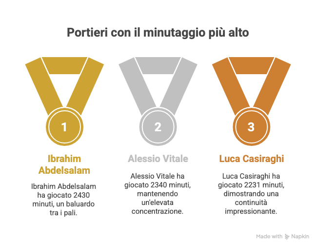 In cima alla lista si colloca Ibrahim Abdelsalam del Niguarda, con 2430 minuti totali, autentico baluardo tra i pali che non ha mai perso il posto da titolare. Il suo rendimento è stato una garanzia per tutta la stagione, dimostrando affidabilità e resistenza in ogni gara disputata. Subito dietro, Alessio Vitale del Tribiano ha difeso la sua porta per 2340 minuti, mantenendo un’elevata concentrazione e un rendimento costante. Completa il podio Luca Casiraghi del Pozzuolo, che con 2231 minuti ha fatto registrare una continuità impressionante per un ragazzo della sua età. Questi tre portieri non solo hanno giocato tanto, ma lo hanno fatto con efficacia, dimostrando quanto sia difficile togliergli i guantoni di dosso.