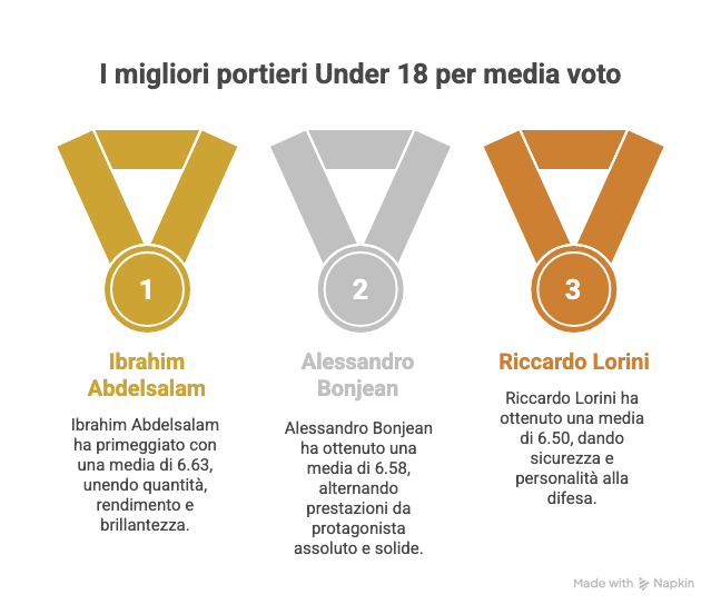 In questa classifica, a primeggiare è ancora Ibrahim Abdelsalam, che con una media di 6.63 ha saputo unire quantità, rendimento e brillantezza. Dietro di lui si piazzano due profili interessanti come Alessandro Bonjean del Rozzano e Riccardo Lorini della Barona, rispettivamente con 6.58 e 6.50 di media. Bonjean ha alternato partite da protagonista assoluto a prestazioni solide e senza sbavature nella stagione culminata con la vittoria dello Scudetto, mentre Lorini ha dato sicurezza e personalità a tutto il reparto difensivo. Ma per capire davvero chi siano stati i migliori portieri Under 18, è necessario incrociare il dato della media voto con un altro indicatore significativo: il rapporto tra clean sheet e presenze.