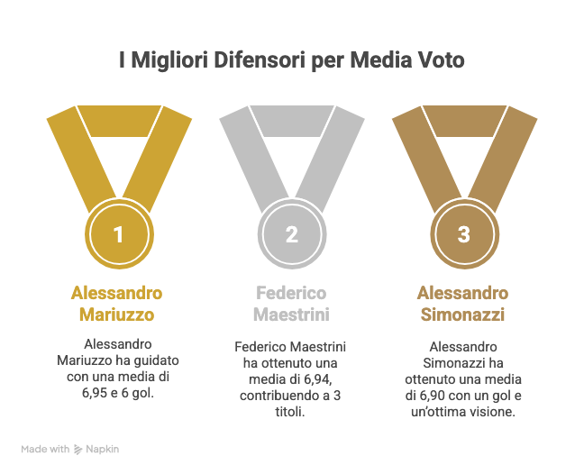 Il miglior difensore per media voto è stato Alessandro Mariuzzo del Tribiano. Con una media straordinaria di 6,95 in 22 presenze, e 6 gol segnati, Mariuzzo ha rappresentato il prototipo del difensore moderno: solido dietro, ma anche pericoloso nelle sortite offensive. La sua lucidità e la leadership difensiva sono state un faro per i compagni di reparto. Al secondo posto c’è Federico Maestrini del Rozzano, che ha chiuso con una media di 6,94 in 25 partite. Maestrini si è distinto per l’eleganza nei movimenti, la precisione nei contrasti e la serenità con cui ha gestito le fasi delicate delle partite, contribuendo prima alla vittoria del campionato, poi del secondo titolo regionale consecutivo e, infine, al primo leggendario Scudetto di una squadra lombarda in categoria. Terzo in questa speciale classifica è Alessandro Simonazzi della Barona, che ha mantenuto una media voto di 6,90 in 24 presenze, segnando anche un gol. Dotato di un’ottima visione di gioco, è stato fondamentale nel far ripartire l’azione e nel coprire con attenzione ogni spazio in fase difensiva.
