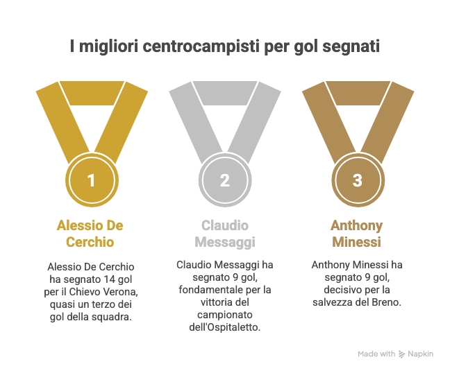 Un numero che va a premiare sicuramente i giocatori posizionati più sulla trequarti e sulle fasce, anche quelli però da comprendere nel funzionamento del centrocampo. Lì, dove a brillare in zona gol è su tutti Alessio De Cerchio, autore di ben 14 reti con il Chievo Verona, quasi un terzo di tutta la squadra. Alle sue spalle, a pari punti completano la classifica Claudio Messaggi, Anthony Minessi e Federico Fanini, tutti a quota 9. Il primo asso fondamentale nella vittoria del campionato targata Ospitaletto, il secondo decisivo per la salvezza del Breno e il terzo per quella del Vigasio.
