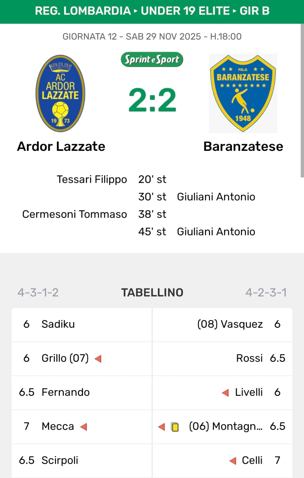 Nel secondo tempo si accende tutto. Al 15’ ancora Tessari fa tremare la porta con una traversa clamorosa, preludio al vantaggio di casa: al 20’ Fernando verticalizza, proprio il «Cowboy» attacca lo spazio, salta il portiere in uscita con un pallonetto e poi appoggia dentro l’1-0, nonché il decimo gol di un campionato fin qui da terzo miglior marcatore di tutto il girone. Il vantaggio della capolista, però, dura solo 10 minuti, quelli che bastano alla Baranzatese per reagire: Airaghi salta l’uomo nello stretto, entra in area e serve a rimorchio Giuliani, che non sbaglia. L’Ardor non si disunisce e all’38’ produce la giocata più bella del match: Cermesoni va via a sinistra, salta il diretto avversario sulla linea di fondo e da posizione quasi impossibile sorprende il portiere sul primo palo per il 2-1. Per i ragazzi di Ferrari sembra fatta, ma c'è qualcuno che ha altri piani. Nel finale, infatti, i brianzoli sbagliano l’ultima lettura difensiva, l’esterno ospite arriva sul fondo e mette dentro per Giuliani, che in un colpo solo fa doppietta, 2-2 e 8 gol in 9 partite, confermandosi uno dei classe 2008 da tenere d'occhio anche nel girone di ritorno.