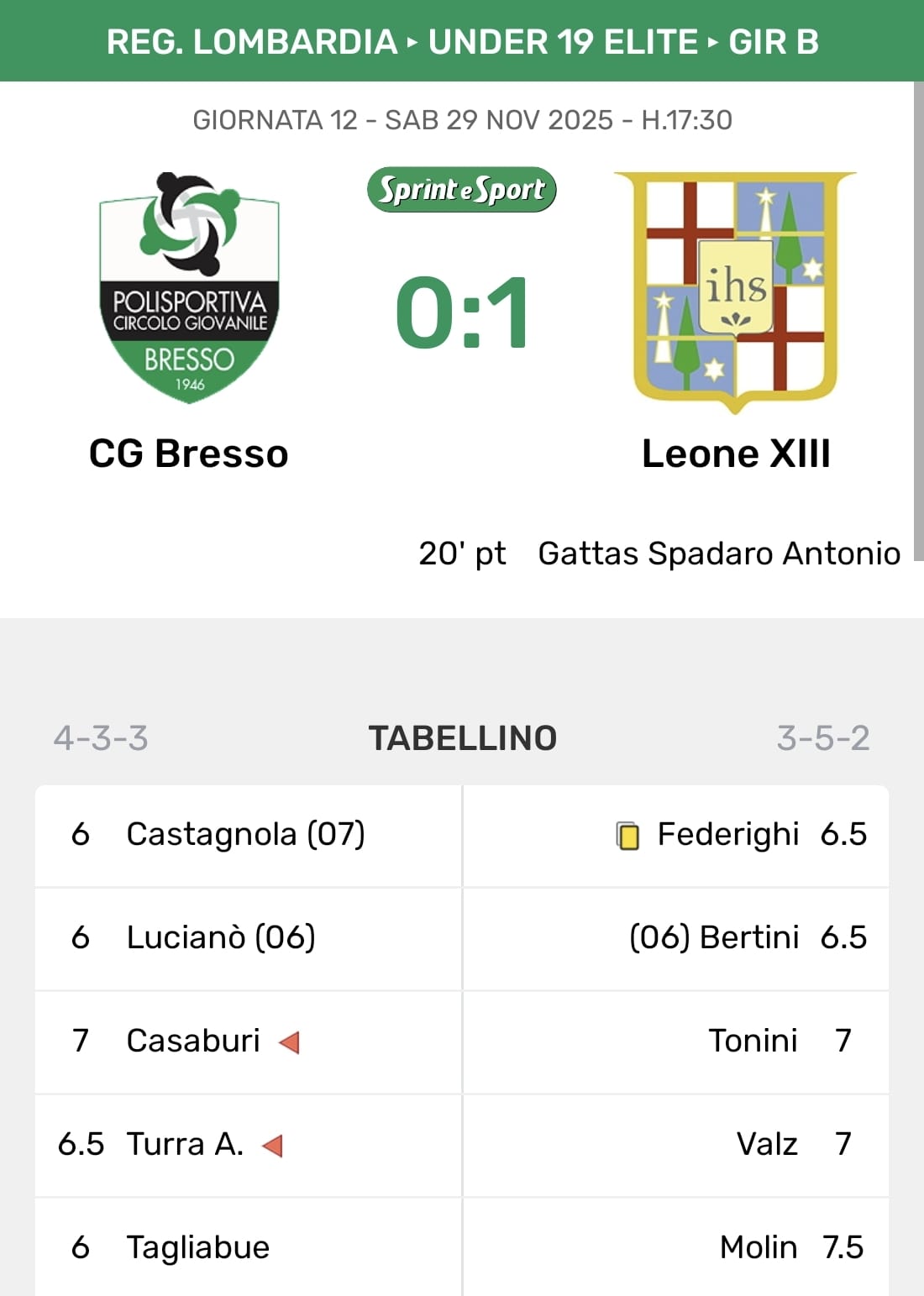 Delicata? No, pura carta vetrata. Una superficie abrasiva, in grado di lasciare segni che alla lunga potrebbero fare la differenza. Una sfida tagliente, uno scontro diretto tra ultima e terzultima in classifica a cui CG Bresso e Leone XIII arrivano nel loro momento migliore: due risultati utili di fila per la prima, due vittorie in tre giornate per la seconda. Risultato? Il peso del match si sente, ma già nel primo tempo la sfida è viva. Il CG Bresso spinge con Lenti, fermato dalla traversa su cross e da una parata di Federighi, Bozzuto, che sfiora il palo su azione manovrata, e Di Chiara, che arriva in ritardo di un soffio su un pallone in mezzo. Il Leone XIII, invece, fatica a trovare profondità nei primi 20 minuti, però colpisce su palla inattiva: calcio d’angolo battuto da Valz, stacco imperioso di Gattas e palla in rete per lo 0-1. L'occasione principe dei milanesi nel primo tempo, oltre a una situazione pericolosa su un’uscita alta del portiere chiusa in extremis dalla difesa di casa, ma sufficiente per andare a riposo in vantaggio.