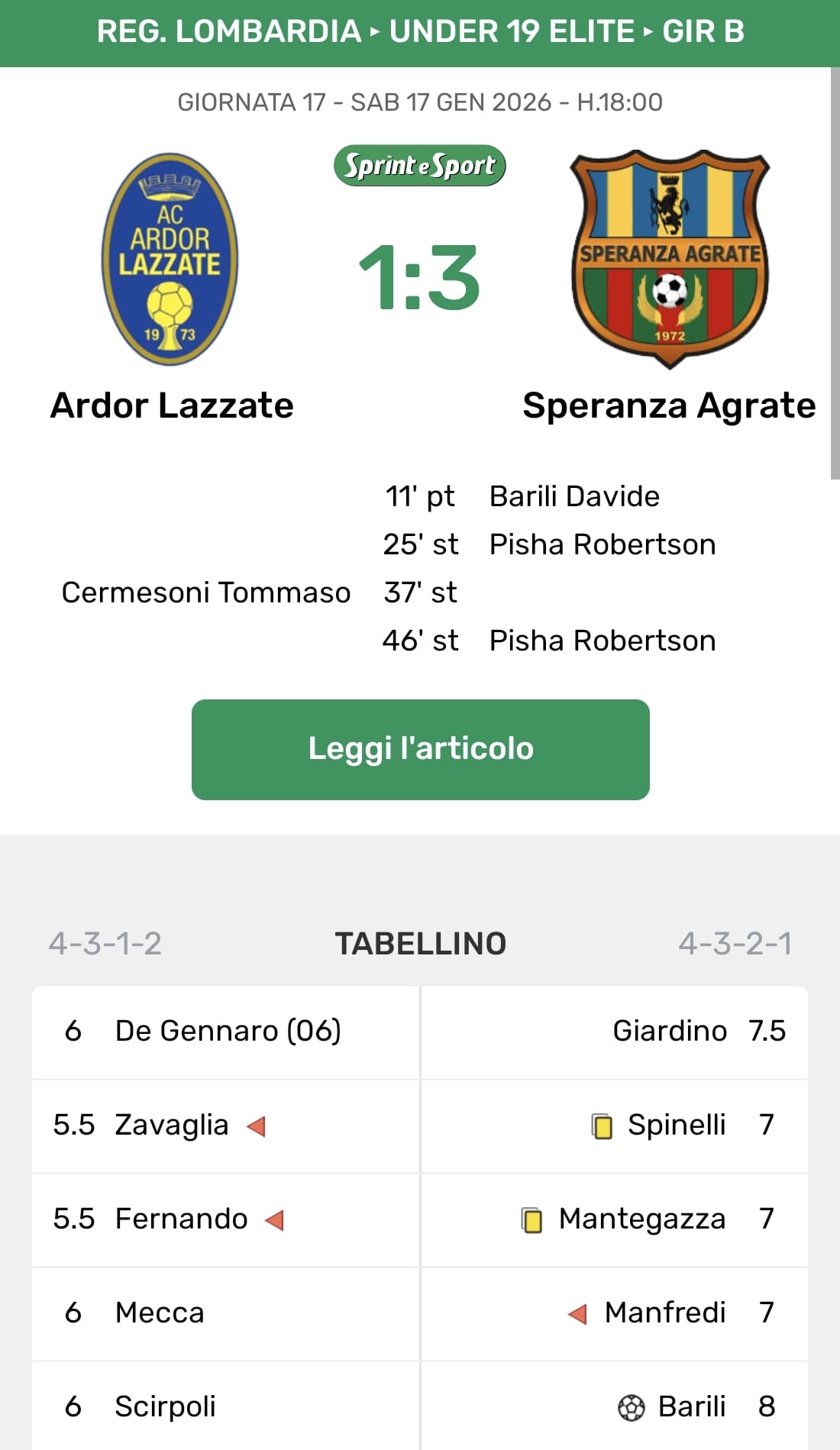 Nel secondo tempo la Speranza continua a gestire e colpisce nel momento giusto: al 25’ Pisha riceve da D’Amore, si accentra e disegna un destro a giro dal limite che vale lo 0-2. Poco dopo lo stesso Pisha si vede annullare il gol del possibile tris per fuorigioco. L’Ardor Lazzate non molla e rientra in partita al 37’ con Cermesoni, bravo a sfruttare un momento di pressione e a firmare l’1-2. Il finale diventa più combattuto, ma nel recupero la Speranza chiude definitivamente i conti: Stimabile recupera palla a centrocampo, verticalizza e Pisha anticipa il portiere superandolo con freddezza per l’1-3. È la seconda doppietta consecutiva per il bomber, a quota 9 reti in 9 partite, è il terzo successo di fila per la formazione di Bosco, tutti con 3 gol fatti. Un periodo di forma straordinario, come la prestazione di Pisha e quella difensiva di un Barili che si conferma pilastro dei rossoverdi: giocatore più impiegato con 1424 minuti giocati, unico con 17 presenze su 17. Sugli scudi anche Giardino, Gelmini, Penati e Cecchi, che portano i brianzoli a -3 dal quarto posto (a pari punti con l'Ardor) e a +8 sulla zona playout.