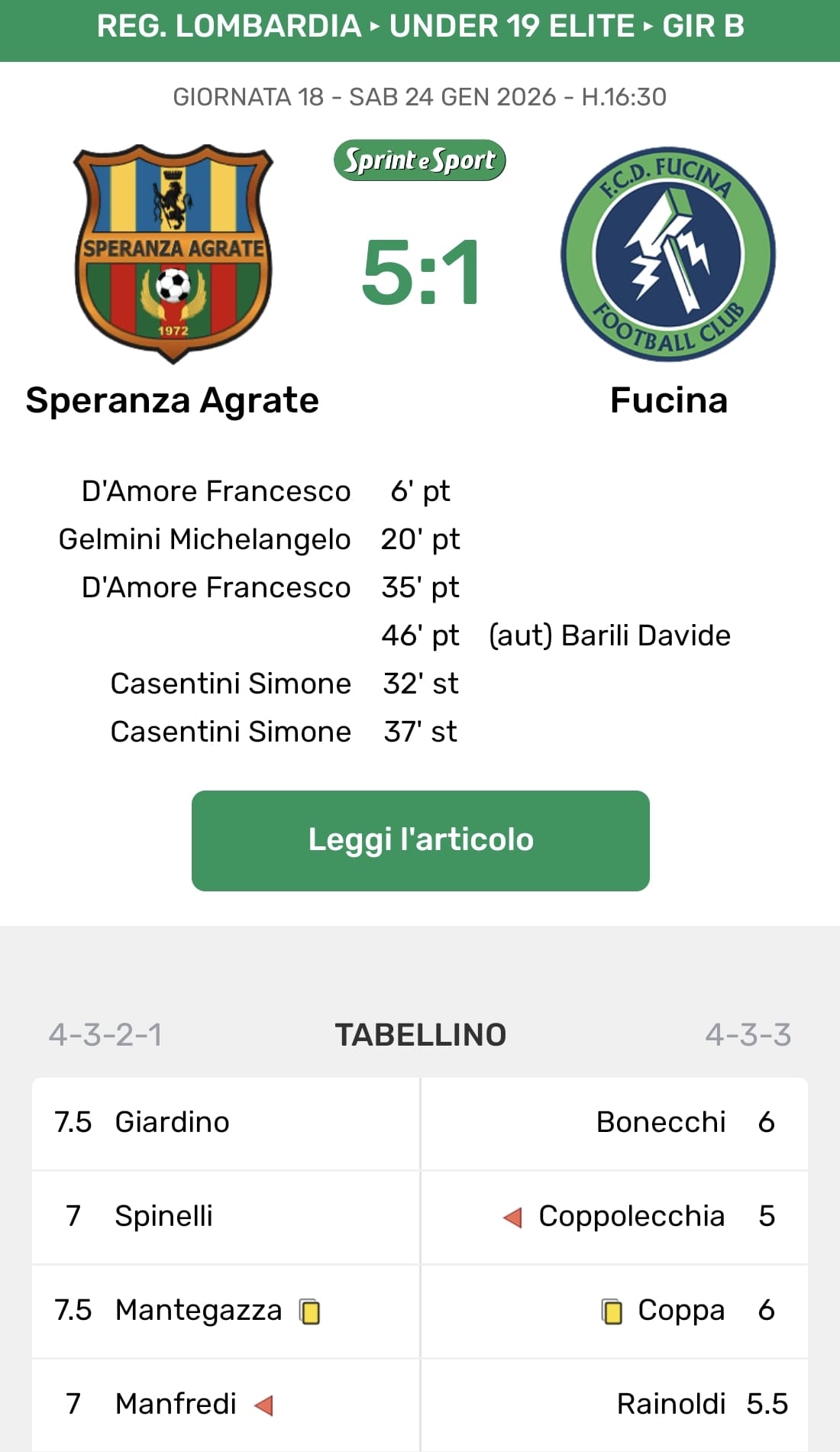 30 minuti e c'è già da mettere un trattino: 3-0. Il netto vantaggio che si assicura la Speranza Agrate, protagonista di una partenza perfetta. Prima Penati trova Mantegazza sulla fascia, che in mezzo pesca D'Amore per l'1-0 (6'), poi Gelmini raddoppia grazie a una palla visionaria a trivela di Cecchi, anticipando il portiere in uscita (20'), infine D’Amore firma la doppietta personale con un tiro forte sul primo palo sul rimorchio di Mantegazza (35'). In mezzo, anche una traversa di Manfredi su punizione che conferma la superiorità dei padroni di casa. La Fucina prova a reagire e trova il gol al 46’ con una sfortunata deviazione di Barili su cross dalla destra di Montoncelli, che accorcia le distanze sul 3-1 e riapre parzialmente la gara prima dell’intervallo.