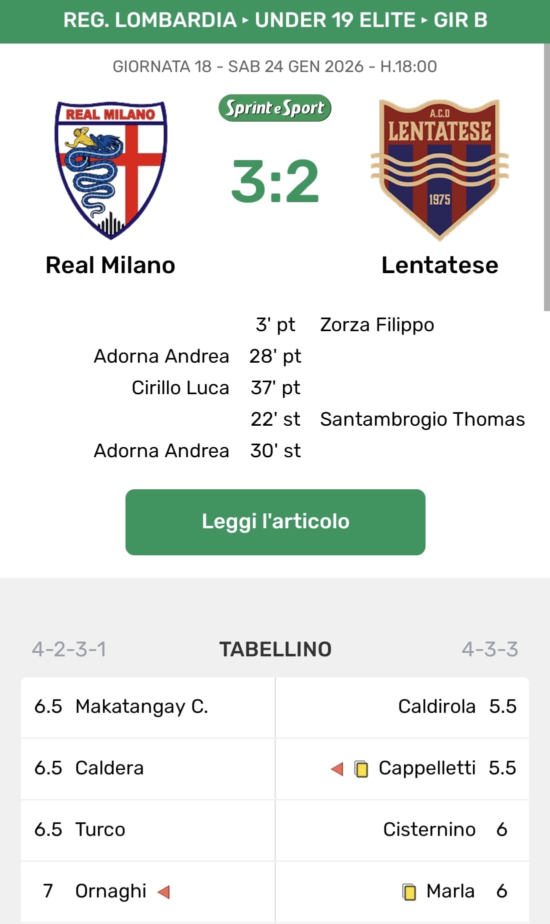 Nella ripresa il Real Milano parte forte, trova il tris con Cavallini, annullato per fuorigioco, ma su un calcio d’angolo concede spazio e la Lentatese ne approfitta: al 22’ Santambrogio svetta di testa e trova il 2-2, rimettendo tutto in equilibrio. La partita resta apertissima, con occasioni da entrambe le parti, finché a ergersi è ancora lui: Adorna. Capocannoniere e leader della squadra, il classe 2007 al 30’ trova il gol decisivo: Sylla fa partire la ripartenza e il numero 9 fa doppietta, salendo a quota 13 gol in 18 gare, meno solo di Mucedola e Ripamonti in tutto il campionato. Un terzo posto nella classifica marcatori quasi consolidato con il tris personale, anche questo negato per offside, ma poco cambia: il Real Milano vince la sua seconda partita consecutiva, la quarta nelle ultime 5, aggancia la salvezza diretta e amplia a +9 la forbice sulla Casati Arcore. Merito del suo bomber, di un Cirillo in forma smagliante e delle prestazioni top di Dipalma e Ornaghi.