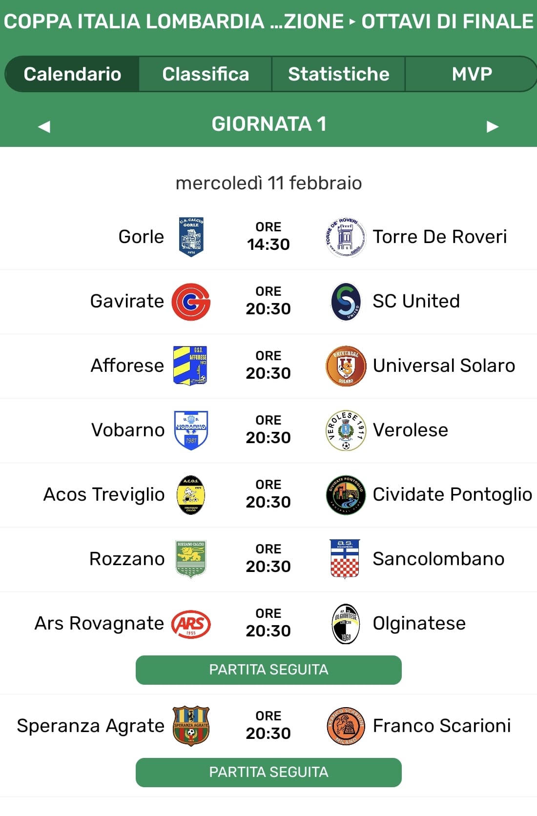 Lo stesso raggruppamento di Rozzano e Afforese, impegnate nella lotta salvezza e chiamate a sfidare rispettivamente Sancolombano (ottavo nel Girone F) e Universal Solaro (sesto nel Girone C). A completare il programma due sfide tra rivali in campionato, ovvero Gavirate-SC United (locomotiva dei playout e fanalino dei playoff nel gruppo C, separate da 6 punti) e Vobarno-Verolese (terza e sesta potenza del Girone E, divise da 3 lunghezze). Otto partite da disputarsi nell'arco dei 90 minuti regolamentari, con i tiri di rigore a sentenziare i vincitori in caso di parità. Otto posti in palio per dei quarti di finale (in programma mercoledì 4 marzo) i cui abbinamenti verranno sorteggiati giovedì 12 febbraio alle ore 16:30.