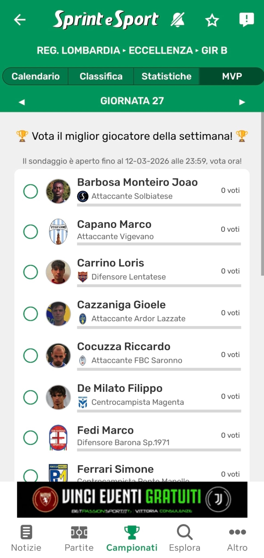Per votare vai su CAMPIONATI, seleziona REGIONALI LOMBARDIA, ECCELLENZA e vota nella sezione MVP cliccando su QUALSIASI GIRONE