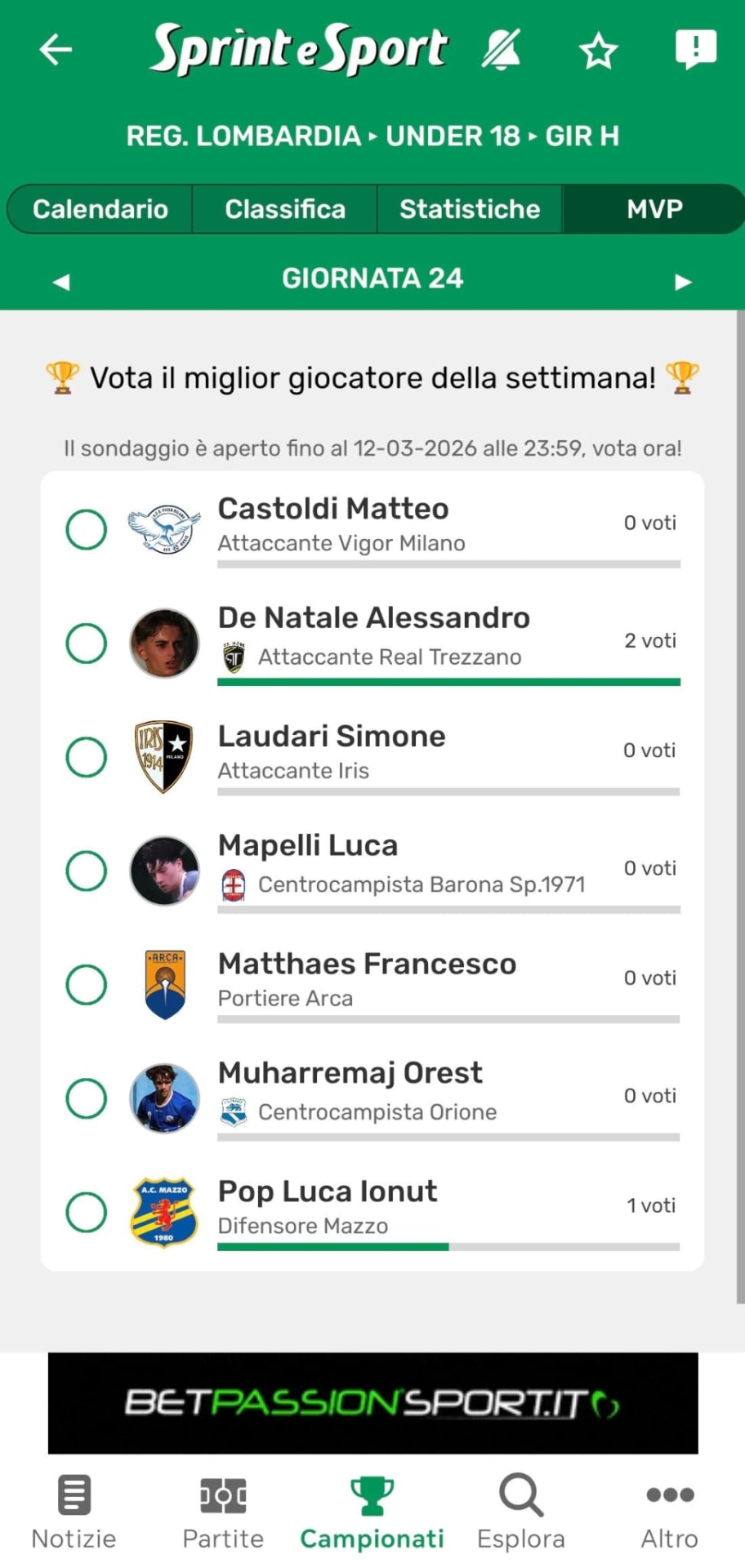 Per votare vai su CAMPIONATI, seleziona REGIONALI LOMBARDIA, UNDER 18 e vota nella sezione MVP cliccando sul GIRONE