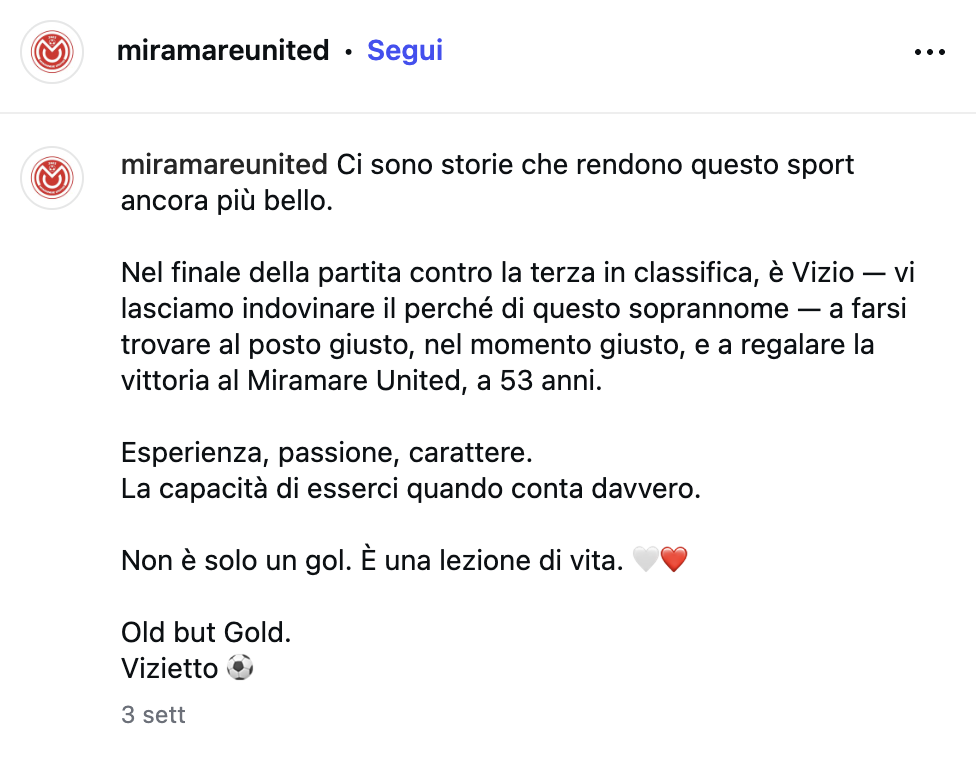Restano le cifre – 343 gol e una caccia aperta ai 350 –, certo. Ma resta soprattutto la coerenza: l’idea che il calcio, declinato nella sua forma più autentica, appartiene a chi lo vive senza riduzioni, con una fame che non si addomestica. Restano le mani che indicano l’area quando la squadra sembra sbandare, lo sguardo che pesa la postura del difensore, l’urlo che libera al 94’ una settimana di sacrifici minimi ma costanti. Resta la semplicità estrema di un uomo che, di fronte alle proposte di “fare il dirigente” o “mettersi in panchina”, risponde con la frase più antica di tutte: «Io voglio giocare». E finché in Seconda Categoria ci sarà un pallone che danza all’altezza del dischetto, finché una squadra come il Miramare United avrà bisogno di un riferimento in area, finché un avversario come la Mondaino Alta Valconca pretenderà concentrazione fino all’ultimo secondo, finché l’orizzonte dirà sette e poi – chissà – trecentocinquanta, Daniele Sanchi continuerà a mettersi in moto un attimo prima degli altri. Perché certi bomber non finiscono: semplicemente, continuano.