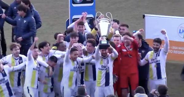 Maycol Andriani, capitano del Ciliverghe, alza la Coppa Italia d'Eccellenza dopo il successo sul Mapello, è il quinto club bresciano ad aggiudicarsi il trofeo dopo Quinzano, Salò, Darfo e Verolese