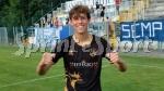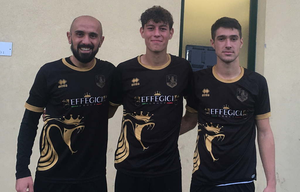 Il classe 2004 insieme all'esperto Andrea Lazzaro (a sinistra) e al difensore Riccardo Pedrini al termine della sfida col Club Milanese decisa da un suo gol