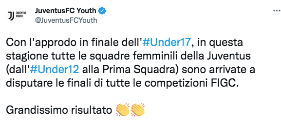 Il suo motto per eccellenza è ‘vincere è l’unica cosa che conta’, abbinato ad un ‘fino alla fine’ dei tempi più recenti. Ma è sempre ritratto di Signora! Sì perchè l’unico club in Italia che è riuscito ad arrivare allo Scudetto e/o alla finalissima che assegna lo scudetto in ognuna delle le categorie e in tutti i campionati con in palio un titolo nazionale, dall’Under 12 alla Serie A, è proprio la Juventus. Un traguardo annunciato e celebrato via Twitter dal club, con un post a celebrare tutto il settore femminile bianconero, che dall’anno di partenza, il 2017, ad oggi, ha scritto pagine indelebili del calcio rosa in Italia, rappresentato ‘l’apripista’ verso un settore fino a quel momento ‘snobbato’ dai grandi club italiani e nel quale invece la Juventus e il suo mentore, Stefano Braghin ha creduto fortemente, dando l’impulso a un movimento in cui, a seguire, sono arrivate poi tutte le altre grandi società, dal Milan all’Inter, dalla Roma alla Fiorentina, dal Sassuolo al Napoli.
