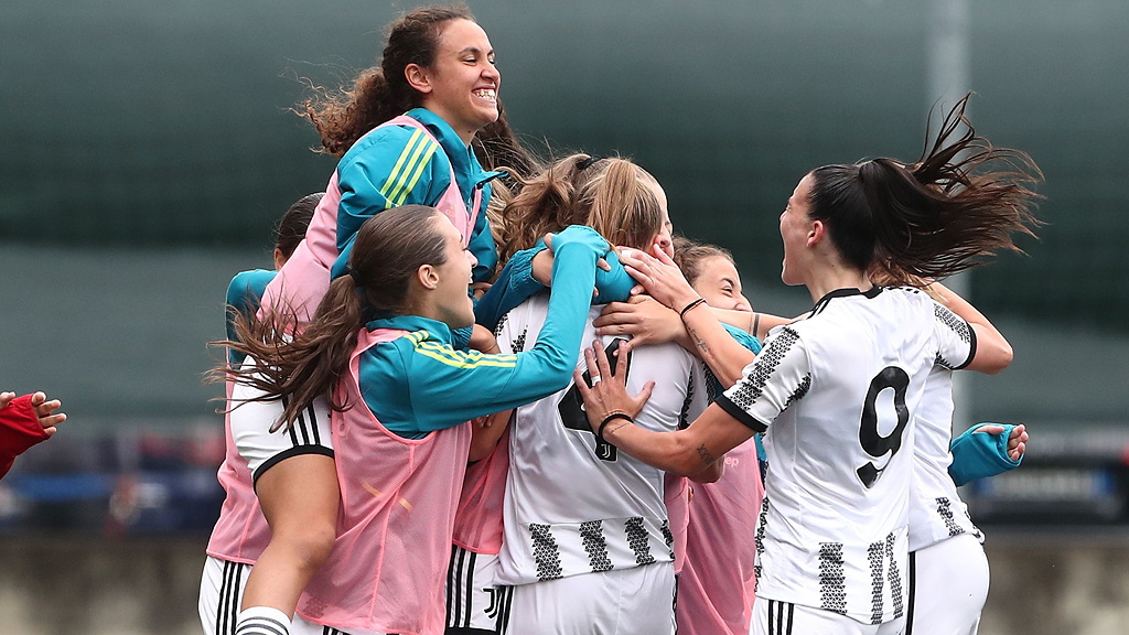 PRIMAVERA FEMMINILE: Ginevra Moretti abbraccia le compagne dopo il gol (Foto FIGC)