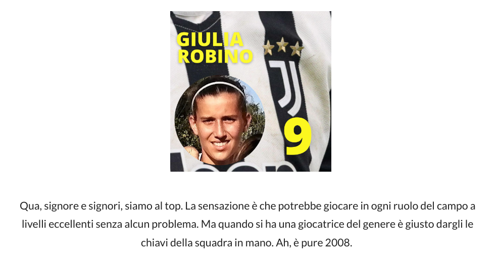 Ubiquità di impiego che per Robino ha trovato il suo apice nella fase finale della passata stagione: aggregata alla Primavera che viene sconfitta in finale Scudetto dalla Roma a Cologno al Serio (anche se in questo caso senza grandi responsabilità, più per farle saggiare atmosfera e livello); impiegata nella categoria Under 15 (ritornando quindi a giocare a 9 con le porticine, dovendosi riadattare a parametri e distanze totalmente diversi), con la Juve che viene superata dal Milan perdendo entrambe le partite. E infine l'epilogo di Senigallia, nella Final Four Under 17, dove Giulia è chiamata a guidare le bianconere. Arriva un'altra sconfitta, sempre con la Roma in semifinale. Fatali i rigori stavolta, con il suo errore a mandare avanti le giallorosse. Tre fasi finali per lei, e il più classico degli "zeru tituli": una bella mazzata da superare quando sei considerata da tutti la stella delle giovanili della Juventus.