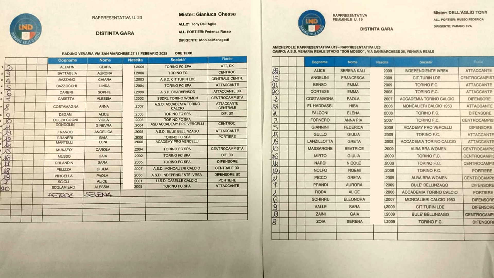 RAPP FEMMINILE UNDER 19 SPERIMENTALE (4-3-3): Graneri (1' st Scicli); Costamagna Paola (1' st Valle), Falconi (1' st Giannini), Zoia (1' st Schirru), Fornero (1' st Prandi); Nardi, Mirto (1' st Massarone), Angelini; Benso, Gullo (1' st El Haddassi), Zaini (1' st Picco). All. Antonio Dell'Aglio.
