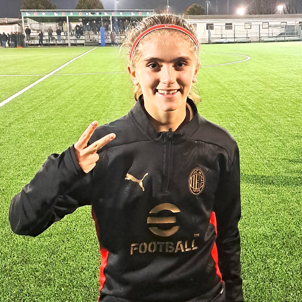 Il secondo quarto di finale della serata tra Milan e Real Meda inizia con un colpo di scena. Sono passati solo alcuni minuti, infatti, quando un disimpegno difensivo apparentemente innocuo del Milan si tramuta in un'autorete che porta avanti il Real Meda. Il merito della squadra di Sacchi, però, è quello di mantenere calma e concentrazione, senza farsi prendere dalla foga di rimediare all'errore e di vincere la partita contro una formazione che pure darà l'idea di pagare un pizzico di timore reverenziale. Inizia così una ragionata di ricerca del pareggio da parte del Milan, che nel periodo successivo mette in mostra una variegata collezione di schemi per i calci d'angolo, tutti battuti corti. Sul primo, di Raffaelli, Raso lascia scorrere con un velo per la conclusione di Cozzi. È una prova generale, perché poco più tardi è sempre Cozzi a trovare la deviazione vincente dopo un gioco di prestigio di Maya. Il Real Meda risponde con un tiro alto di De Nova, provando più volte a innescare la verve di Mariani, ma trovandosi costretto perlopiù a una partita di contenimento. Il primo tempo va così in archivio con l'infortuno di Fiore (una botta alla caviglia che la costringe a uscire anzitempo, sembra però nulla di grave), e con il bellissimo gol del vantaggio di Arianna Toschi. Il cervellino rossonero gioca una partita dinamica e intelligente, impreziosita da due gemme. La prima, è un colpo perfetto dai 20-25 metri che sorprende il portiere scavalcandolo poco prima dell'intervallo.