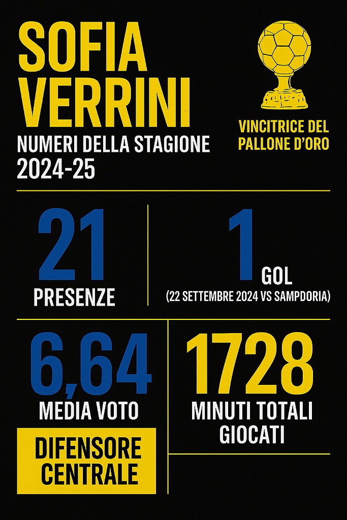 Fisicità, intelligenza tattica, maturità ben oltre la sua età anagrafica: Sofia Verrini incarna il profilo del difensore moderno, capace di costruire ma anche di reggere i duelli più duri. Il Pallone d’Oro Femminile 2025 è il meritato riconoscimento per una stagione da incorniciare e, al tempo stesso, l’inizio di un percorso che ha tutte le carte in regola per portarla ai vertici del calcio italiano.