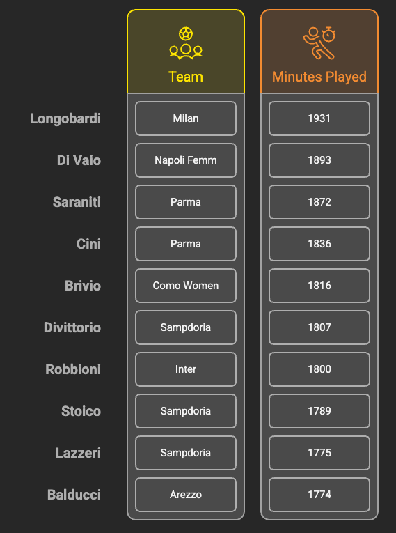 Sul podio e ai piedi dello stesso troviamo due giocatrici del Parma: Saraniti (1872 minuti) e Cini (1836 minuti). Una coppia affidabile, precisa e resistente, che ha fatto della costanza il marchio di fabbrica. Il fatto che entrambe siano tra le più impiegate d’Italia testimonia anche l’ottimo lavoro di continuità svolto dalla società crociata.