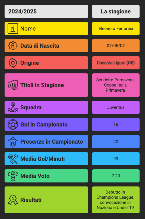 Il 2024/2025 è stato l’anno della consacrazione definitiva dopo l'ottima impressione già suscitata negli anni precedenti di settore giovanile. Nella Primavera della Juventus, formazione allenata dal neo-tecnico Marco Bruzzano, Eleonora ha disputato in stagione regolare 22 partite, segnando 18 gol (seconda soltanto a Rosanna Ventriglia della Roma) e conquistando Scudetto e Coppa Italia. Le sue prestazioni sono state da top player: una rete ogni 93 minuti, media voto 7.20 e un impatto costante su ogni gara. Tra i centri più importanti quelli alla Roma, sia all'andata che al ritorno, la doppietta siglata in casa del Milan il 6 ottobre 2024, o quella alla Fiorentina del 16 febbraio 2025. Numeri la collocano - senza dubbio - tra le migliori attaccanti del panorama giovanile italiano.