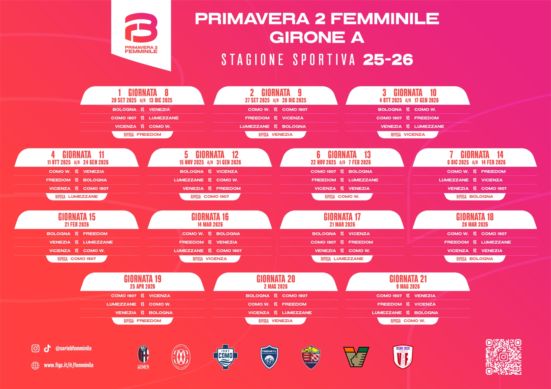 Calcio d'inizio? Il 20 settembre. Format? Identico alla passata stagione: due gironi da sette squadre ciascuno, diciotto partite per ogni formazione. Dalle quattordici giornate della prima fase (andata e ritorno) alle otto conclusive che condurranno al nove maggio. Le prime due classificate di ogni raggruppamento otterranno la promozione in Primavera 1. Per la cronaca, per il derby di Como servirà aspettare il 27 settembre (con ritorno il 20 dicembre, e terzo appuntamento programmato per il 28 marzo).