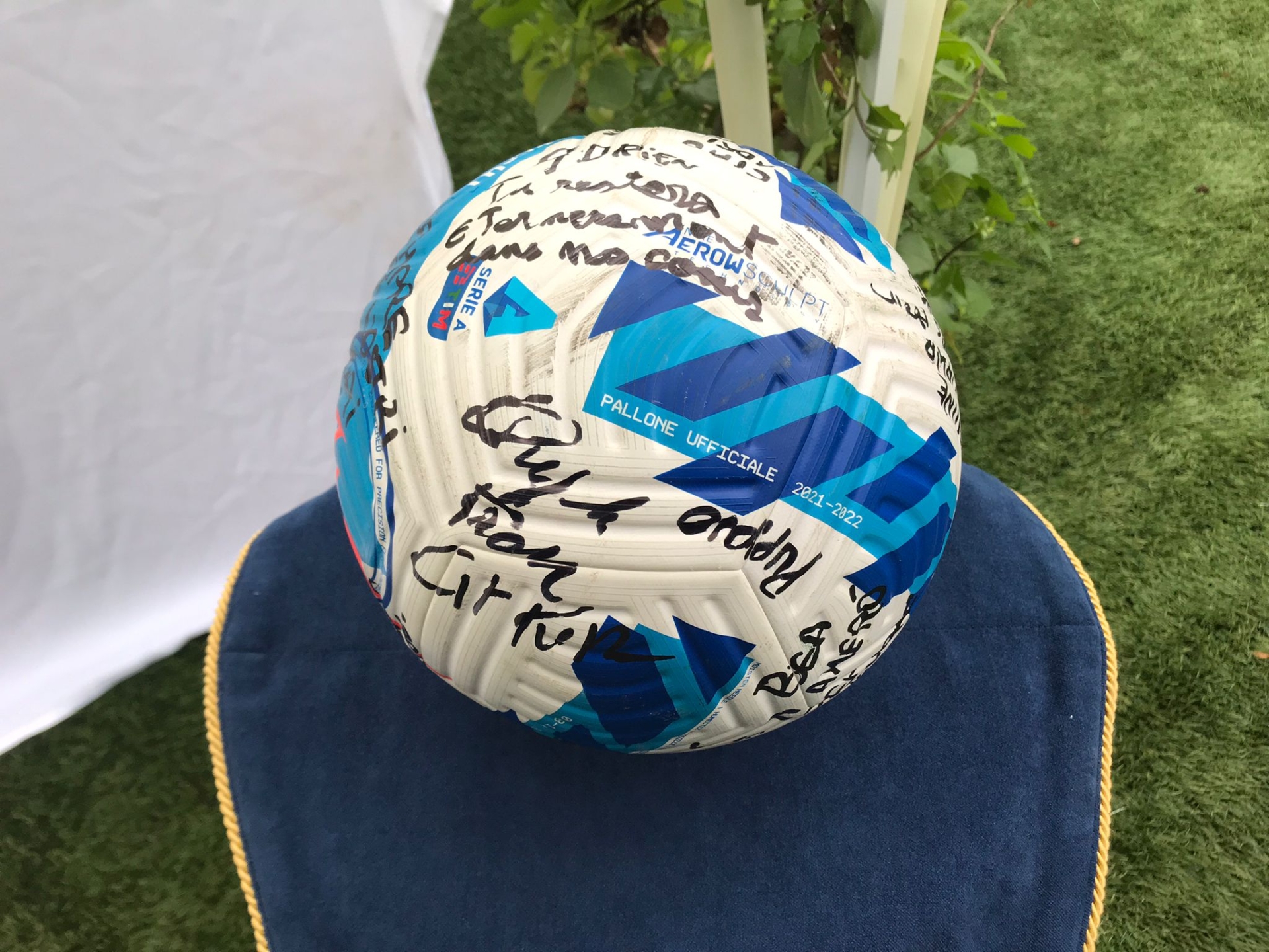 Il massimo dirigente ha poi consegnato, attraverso le mani di due bambine, alla famiglia di Adrien la sua gigantografia con la maglia della Rappresentativa di Licio Russo in modo che questo resti come un bel ricordo sia per la mamma che per tutti i parenti. In conclusione della cerimonia alcuni giocatori del Bacigalupo, squadra che deteneva il cartellino di Sandjo, hanno appoggiato sulla bara una maglia nerazzurra in suo onore. Subito dopo i palloncini, presenti inizialmente a lato dell'altare e poi distribuiti a ciascun partecipante alla funzione religiosa, sono stati fatti volare in cielo simbolicamente verso di lui.