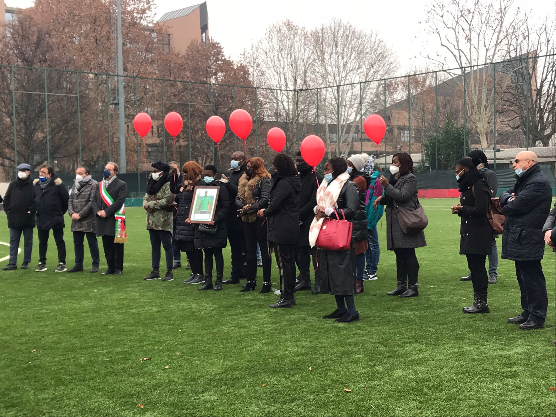 Fiori, sciarpa rossoverde e palloncini in memoria di Adrien Sandjo