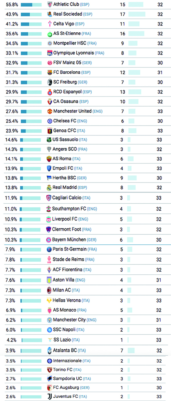 L'osservatorio calcistico CIES ha analizzato l'utilizzo in stagione dei giocatori cresciuti nel vivaio nelle 31 massime divisioni europee e a livello mondiale. Il rapporto è dettato dalla percentuale di minuti concessi ai canterani in campionato, impiego che va da un minimo del 4% della Super League greca al massimo del 26% nel campionato argentino. Ma a livello di club quale è la situazione? Nessuna squadra durante l'attuale stagione dei 'Big-5 league' ha schierato giocatori allenati dal club per una percentuale di minuti maggiore rispetto all'Athletic Club: 55,8%. La squadra basca supera i rivali locali della Real Sociedad (43,9%), mentre il Celta Vigo (41,2%) completa un podio tutto spagnolo. Gli slovacchi del MŠK Žilina (85,5%) sono in testa alla classifica dei club di 40 campionati mondiali. I dati per tutti i club sono disponibili nel 378° CIES Football Observatory Weekly Post.