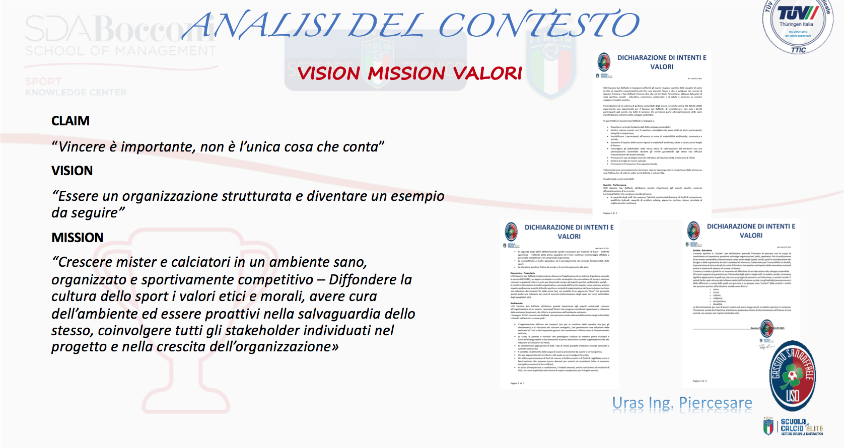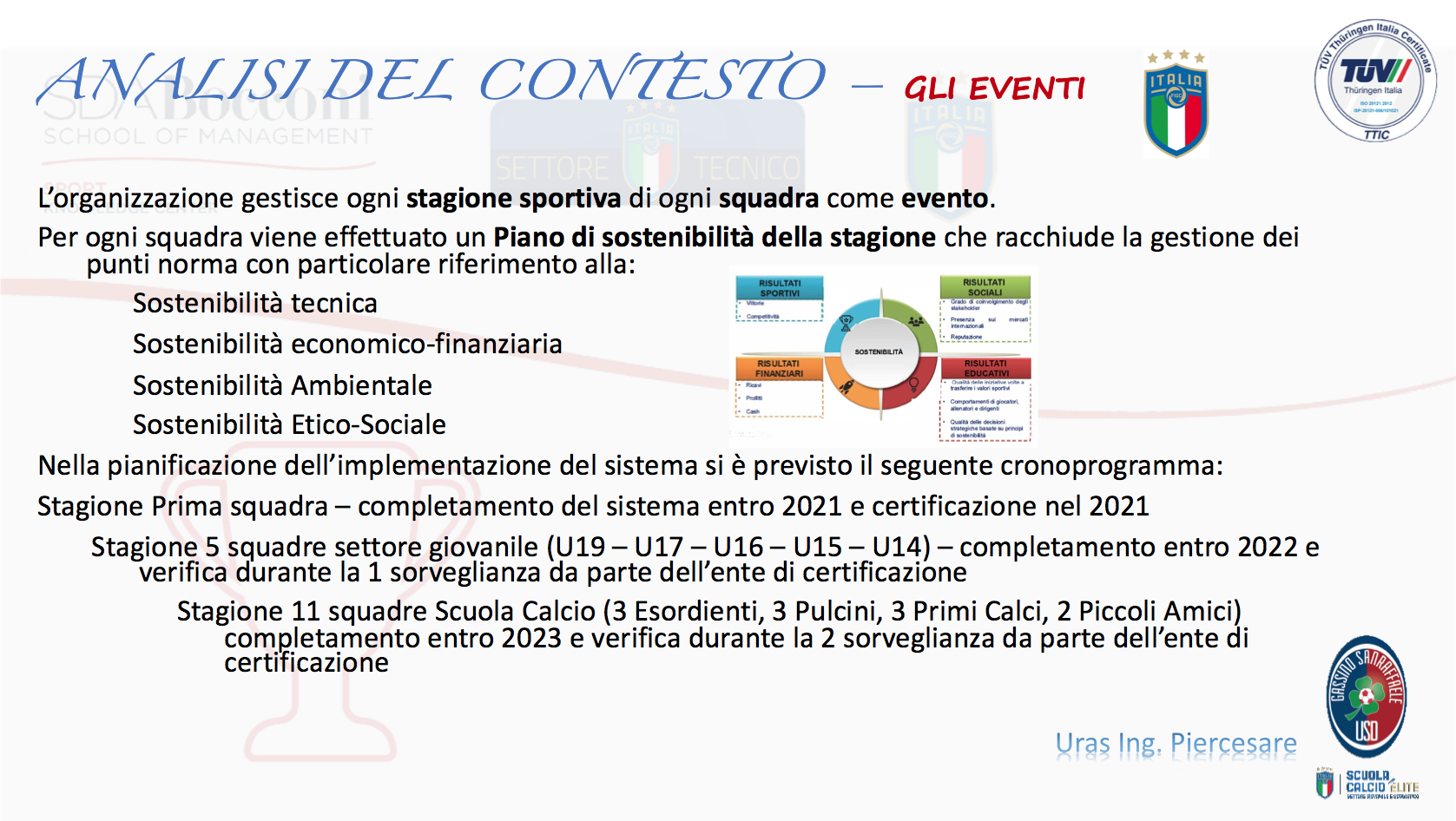 «Siamo qui per dare continuità a quanto fatto - esordisce il ‘gran cerimoniere e anima del progetto e del club, Piercesare Uras -. Siamo l’unica società calcistica dilettantistica in Europa ad aver ottenuto e confermato la Certificato ISO 20121. Un nuovo orgoglio che tutti gli anni bisogna dimostrare di ‘meritare’, dimostrando di aver ottenuto i risultati prefissati e dimostrare di essere in grado di sostenere quelle future. Questo è il concetto di sostenibilità nel tempo, duratura, di una società». Perchè ‘cambiare’ far modo di fare calcio e gestire una società, soprattutto in tempi come quelli attuali è possibile e forse necessario. «Se non parti non arrivi… Il calcio può e deve essere insostenibile ma se tutti rimaniamo fermi non si va da nessuna parte. Noi siamo partiti, siamo un microcosmo in un universo gigantesco ma speriamo di poter essere un esempio da seguire. Non semplice, certo, ma possibile».