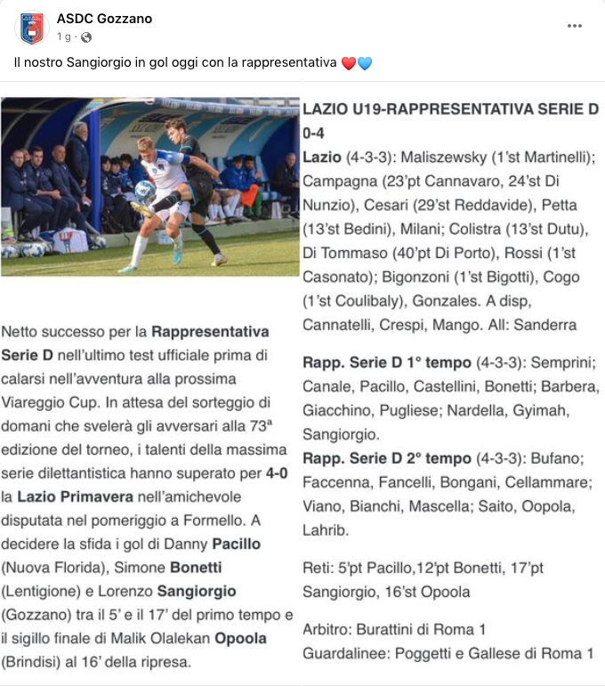 Il post Facebook del Gozzano per il golden-boy Sangiorgio