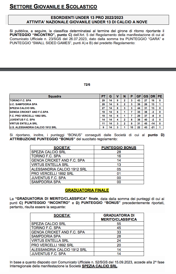 In base al risultato federale ‘a tempi’ più i giochini poi, la classifica invece recitava: Torino primo con 29 punti, poi Sampdoria 28 (con 1 punto di penalizzazione), Spezia 27 punti, Genoa e Pro vercelli 19 punti, Juventus 14, Virtus Entella 11 e Alessandria 9. Ma anche questa classifica è ‘inutile’.