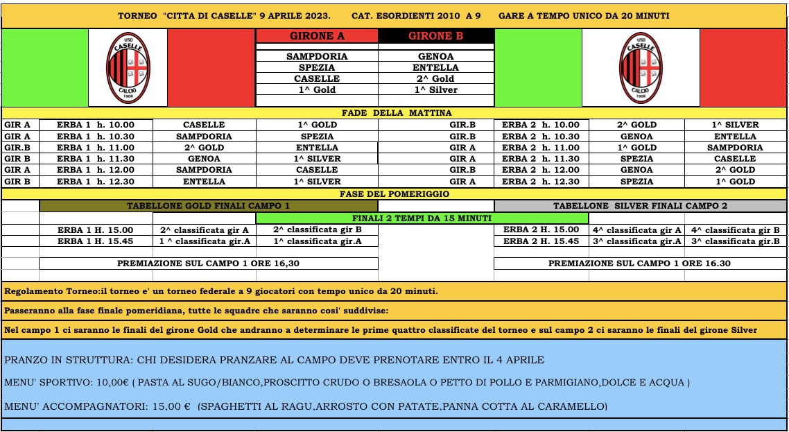 Una festa che proseguirà poi con la grande giornata di domenica 9 aprile, che vedrà in campo la prima e la seconda classifica del girone Gold che sarà stilato sulla base dei risultati delle gare del sabato, più la vincente del girone Silver, sempre sui risultati del sabato. Poi spazio ai padroni di casa del Caselle ma soprattutto arrivano le professioniste! Nella giornata di domenica infatti, saranno presenti la Sampdoria, lo Spezia, il Genoa e la Virtus Entella.