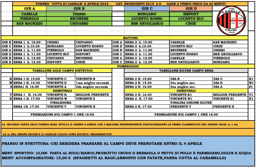 Si partirà con le gare dal sabato mattina, con in campo ben 12 squadre, suddivise in quattro gironi da tre squadre ciascuno con formula del girone all’italiana. Via alle gare già dal mattino di sabato 8 aprile con le squadre che si sfideranno per tutta la giornata che sarà davvero una festa per tutti. Sia i ragazzi delles quadre ma anche familiari e accompagnatori, potranno vivere la giornata presso l’impianto dotato di ogni tipo di servizio (bar, ristorante, aree all’aperto e non solo).