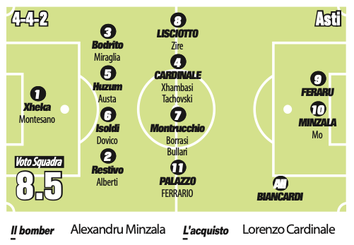 Con Biancardi come guida tecnica il modulo con ogni probabilità sarà il 4-4-2, vero marchio di fabbrica del tecnico: in difesa, al momento, la situazione rimane invariata rispetto allo scorso anno, con Xheka e Montesano a contendersi la porta titolare, e poi con Bodrito, Huzum, Isoldi e Restivo a comporre la linea di difesa, con Miraglia, Austa, Dovico e Alberti che di certo avranno le loro possibilità di giocarsi un posto tra i titolari. A centrocampo, il gioco sarà affidato a un fedelissimo di Biancardi, Lorenzo Cardinale, che dopo l’esperienza al Chieri, ha deciso di seguire il tecnico anche ad Asti, dove avrà la cabina di regia tutta per sé, con anche l’aiuto di Montrucchio, ma occhio alle sorprese, perché Xhambasi, Bullari, Tachovski e Borrasi scalpitano alla grande.