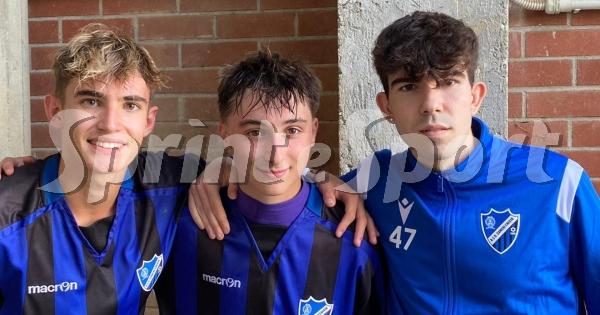 Caltignaga Cameri Under 19: Mattia Elladora, Mattia Rondini e Alessio Lazzari festeggiano i gol segnati e la vittoria conquistata al debutto in campionato
