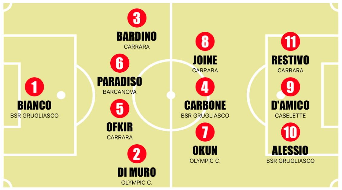 È stato un girone equilibratissimo, che ha visto ribaltamenti e sorprese fino all'ultimo secondo del girone d'andata, incoronando a l'Olympic Collegno di Massimiliano Dossena, davanti al Bsr di Marcello Marina e al Carrara di Carlo Implicito, in virtù dei due scontri diretti vinti al cardiopalma contro le dirette inseguitrici. Assieme però alle tre "big" altre tre squadre, Caselette, Barcanova e Rivoli hanno dato filo da torcere e promettono battaglia fino all'ultimo secondo. Questi quindi i migliori undici giocatori del girone d'andata, secondo un criterio che tiene conto delle statistiche e dell'incisività che questi giocatori hanno avuto all'interno delle loro squadre.