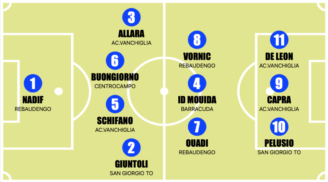 Sette giornate giocate, in campo dal 4 novembre alla sosta natalizia per il campionato Provinciale Under 14. Per questa Top 11 che riguarda il Girone A di Torino abbiamo scelto quattro giocatori della capolista Academy Vanchiglia, tre del Rebaudengo secondo e due del San Giorgio, sono le tre squadre che al momento si stanno contendendo la vittoria del campionato, c'è spazio anche per il capitano del Centrocampo Simone Buongiorno e del trascinatore del Barracuda, il centrocampista centrale Choiba Id Mouida.