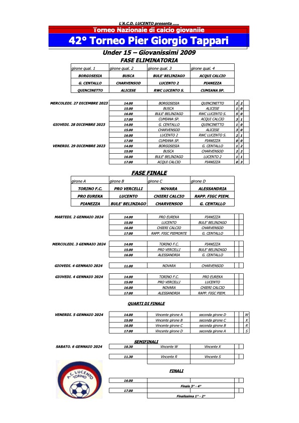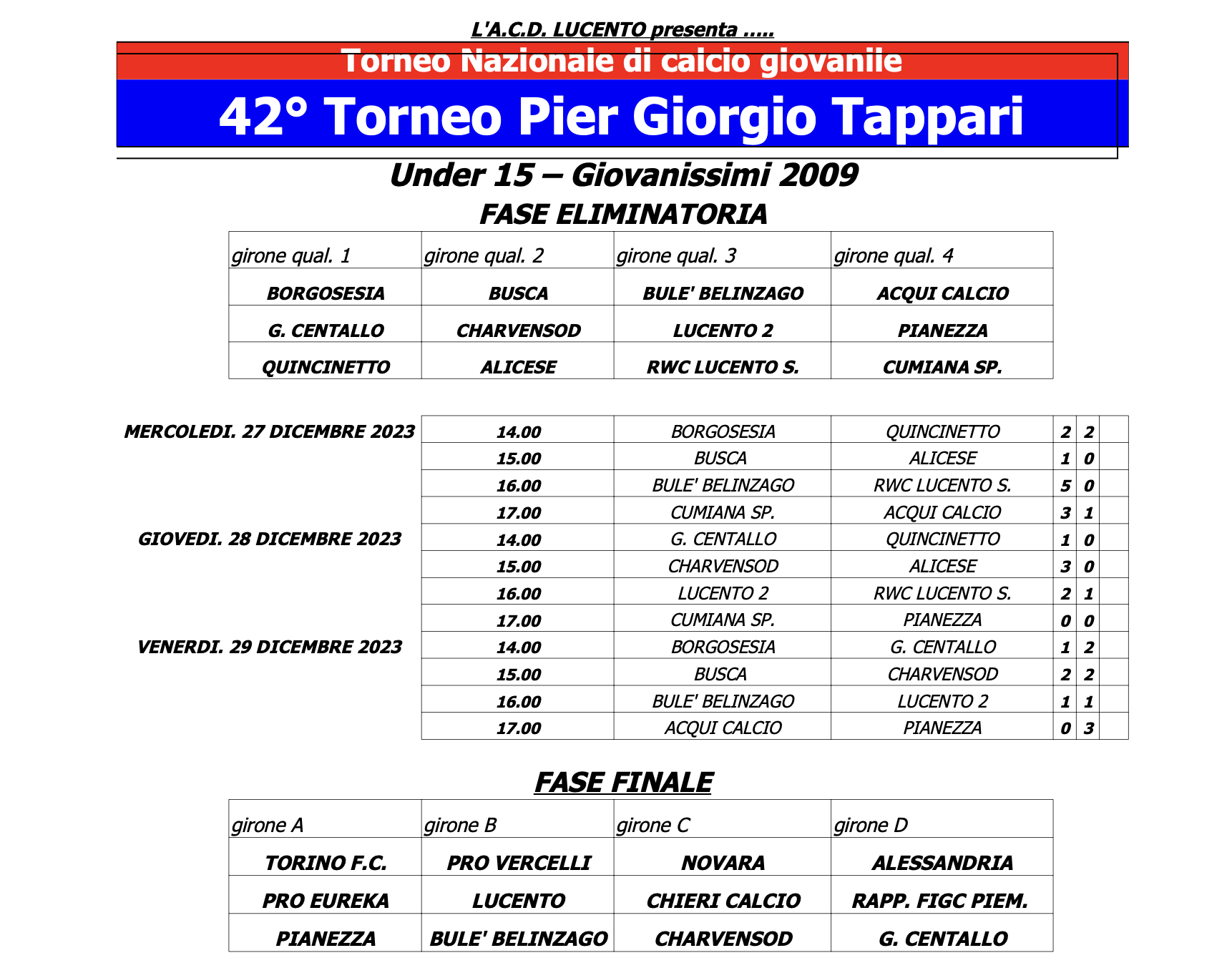 Fase eliminatoria che si è conlcusa con il passaggio al tabellone delle 'finals' che scatteranno il 2 gennaio il Pianezza, il Bulè Bellinzago e il Centallo che andranno così a completare i quattro gironi con le professioniste del Tappari.