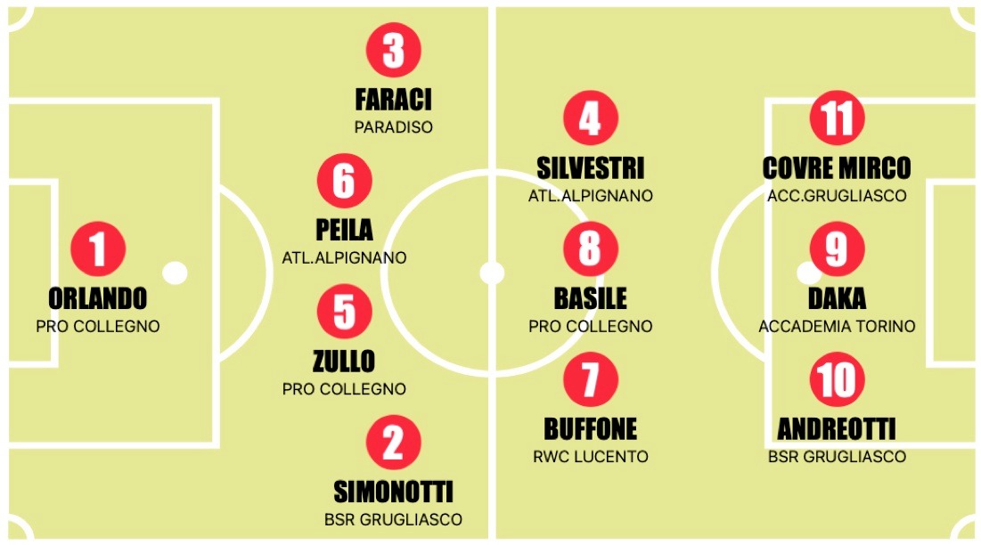 Dopo 7 giornate di campionato abbiamo stilato la top 11 del girone B di Torino, la classifica dopo le prime partite è ancora molto corta e infatti ci sono ben 5 squadre in soli 5 punti, protagonisti di questo inizio di stagione sono la Pro Collegno che può vantare tre suoi giocatori in questa speciale top, così come la capolista Bsr Grugliasco che con 68 gol realizzati ha di gran lunga il miglior attacco di tutti e quattro i gironi torinesi, c'è anche l'Atletico Alpignano con due giocatori, spazio poi ovviamente per Elion Daka capocannoniere indiscusso del campionato e per il perno centrale di centrocampo dell'RWC Lucento, infine una sorpresa che arriva dall'Accademia Grugliasco.