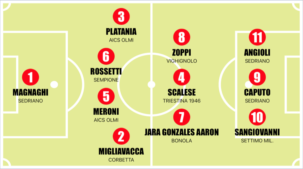 1. Manuel Magnaghi (Sedriano) Portierone del Sedriano: fisicamente ben strutturato, mancino e molto istintivo. Nove reti inviolate in undici partite giocate: il successo dei Leoncini passa anche dai suoi guantoni.