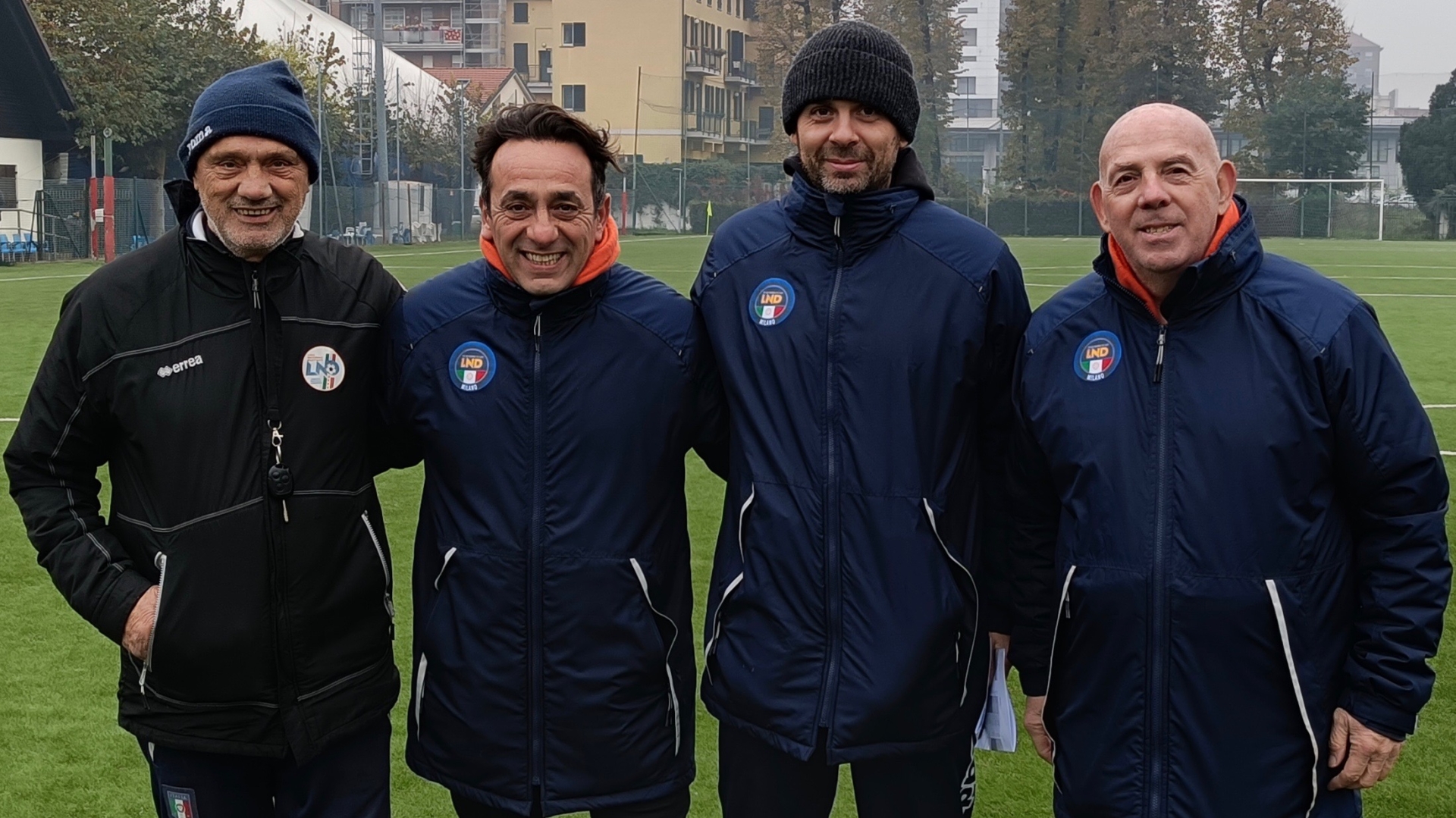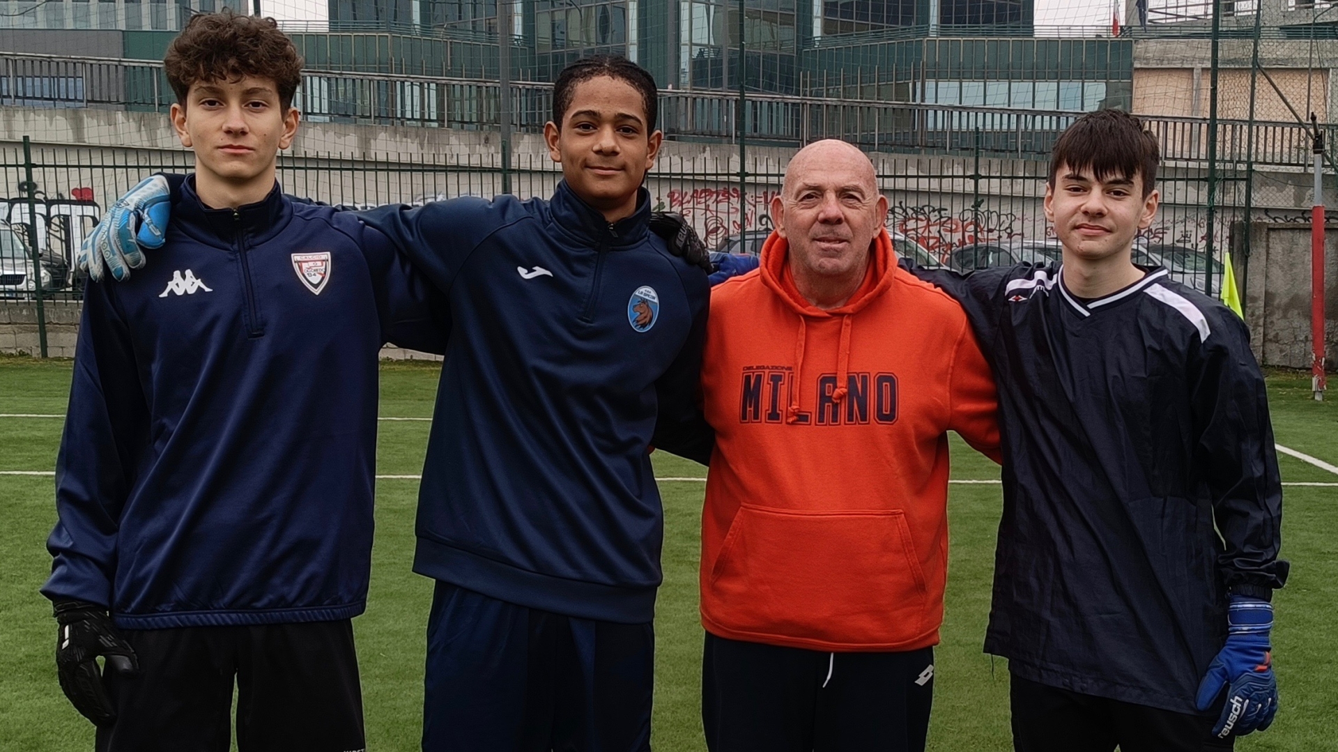 I portieri Gianvincenzo Righi (Rogoredo), Valentino Ramos (La Spezia) e Alessio Cappai (Suprema ODB) assieme al preparatore dei portieri Ezio Colombo