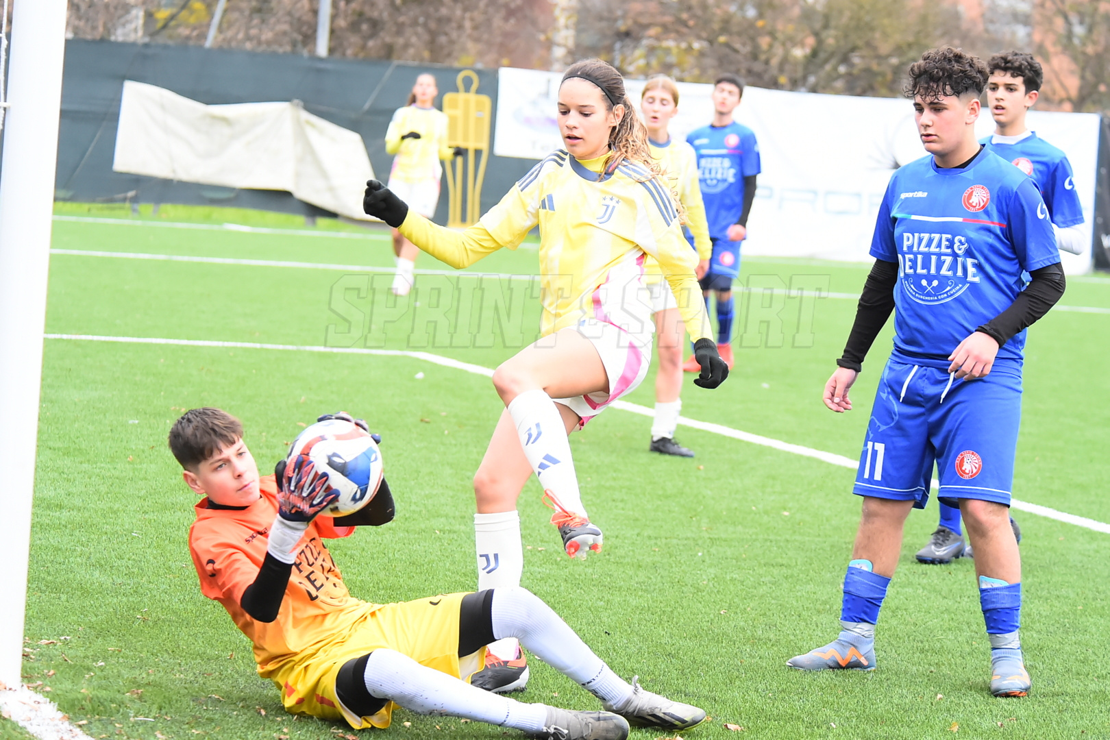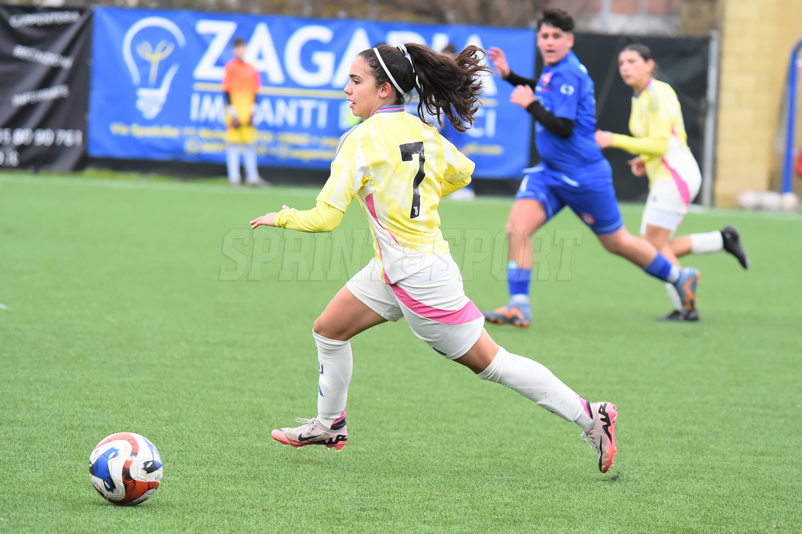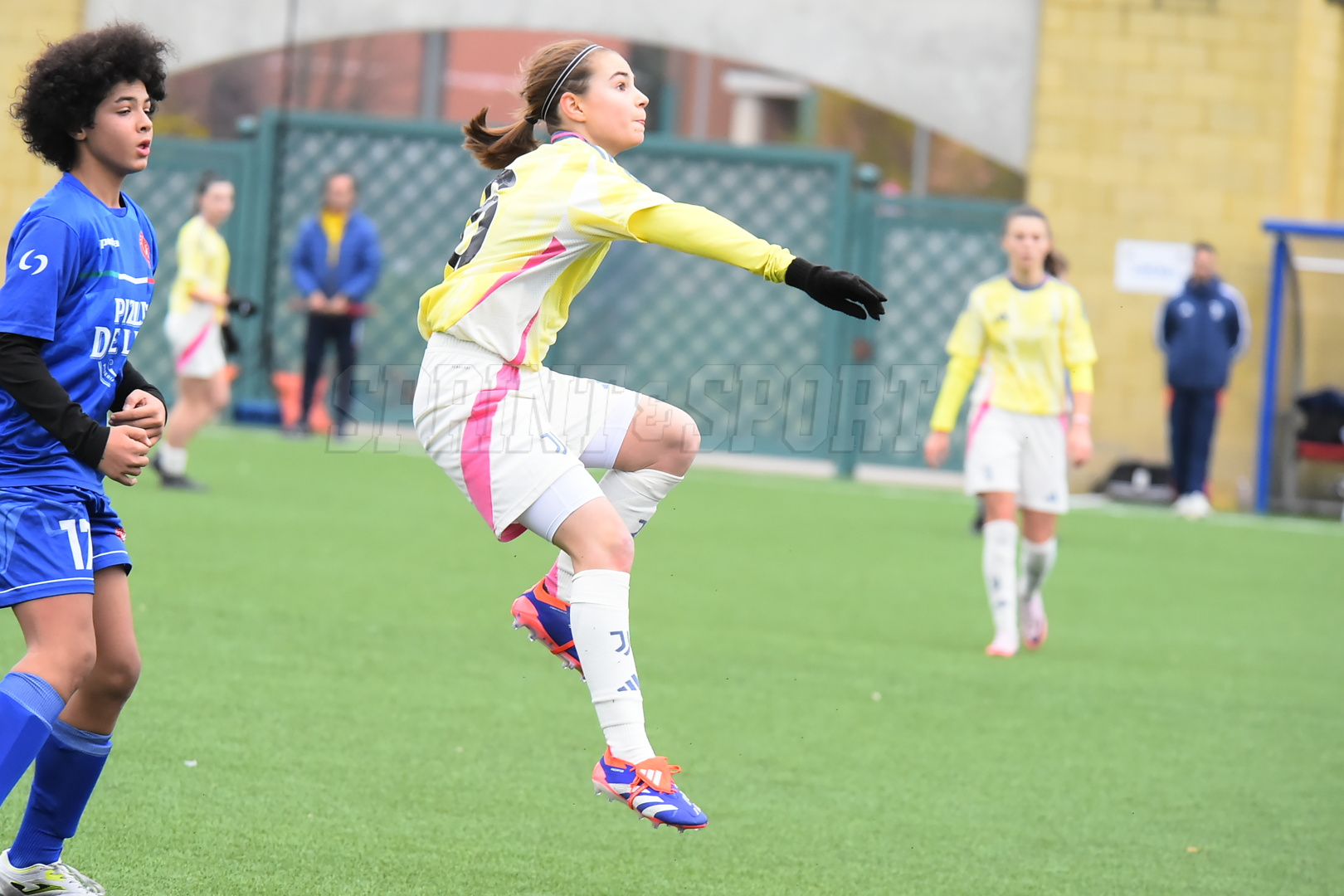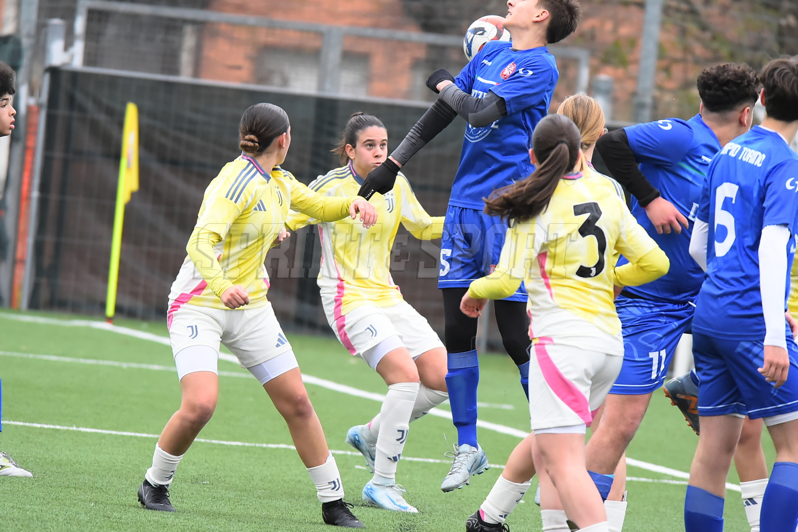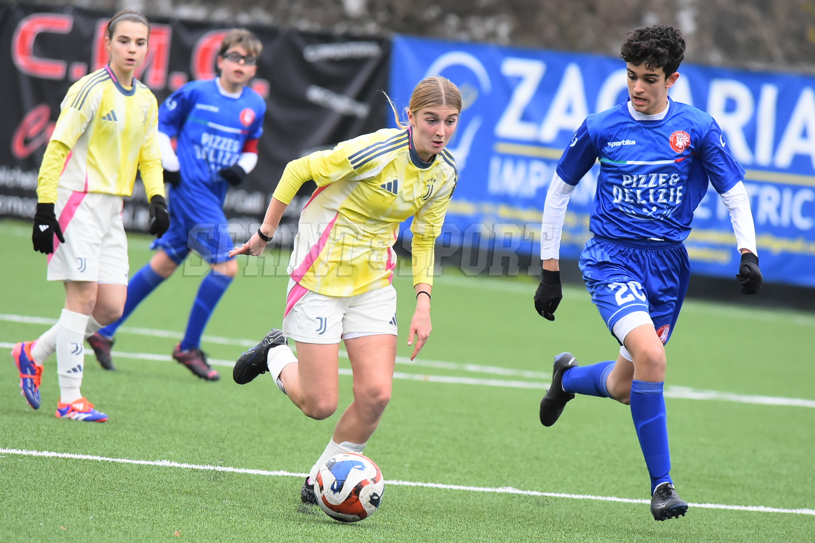 Già dal fischio d'inizio del direttore di gara Martina Giurato di Nichelino si intuisce cosa vuole la Juventus: vincere, l'unica cosa che conta. Per questo le giovani bianconere entrano in campo impostando il gioco e avvicinandosi subito all'area avversaria. Il primo tentativo in avanti arriva, infatti, al minuto 3 con Vittoria Pronzati, che fa capire subito quanto sia forte il feeling con il gol. Passano pochi minuti e le zebrotte spingono ancora grazie a Matilde Oddina, motore di centrocampo e autrice di una prestazione straordinaria. Così arriva il vantaggio e, con esso, si aprono le danze ad una preannunciata goleada: Milena Demarchi tenta la conclusione che viene intercettata da Iannis Vinau, ma sulla respinta Marzia Piermarini riesce a trovare la via del gol. I ragazzi di Pasquale Cella non si lasciano intimorire dal pressing delle avversarie, ci credono e cercano di arrivare nell'area avversaria sfruttando soprattutto la rapidità di Alessandro Longhin, che deve però scontrarsi con una difesa apparentemente impenetrabile che riesce ad anticipare i giocatori avversari. La Juventus comincia a rendersi pericolosa anche su calcio d'angolo grazie ai lanci corti di Marzia Piermarini e al sinistro a pennello di Matilde Oddina, con cui le zebrotte realizzano il raddoppio al minuti 11 grazie al colpo di testa della centrale Daria Rosso.