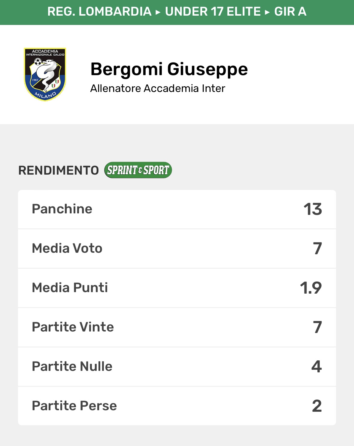Il tecnico nerazzurro spiega: «I momenti di difficoltà fanno parte del gioco. Mi sembra giusto rimanere al mio posto per aiutare la società, i mie collaboratori e soprattutto i ragazzi della squadra, che stanno facendo un buon campionato e devono continuare a crescere». E in conclusione: «Quello che chiedo e che ho già chiesto tante volte è il rispetto: vorrei ci fosse maggiore riguardo tra i giocatori e tra le panchine». Chiaro e tondo, tutto è bene quel che finisce bene. Del resto i ragazzi di Bergomi sono protagonisti di un buon percorso nel difficilissimo girone A: seconda posizione a 28 punti, a -5 dalla Varesina che occupa ormai stabilmente la vetta della classifica. Un ottimo cammino che tra l'altro sta coinvolgendo un po' tutte le annate di via Cilea: Andrea Corti campeggia al primo posto in Under 15 Élite ormai da diverse giornate, l'Under 14 si tiene stretta il terzo gradino del podio nel cuore della zona playoff, mentre Stefano Acquati - in Under 16 Élite - naviga in acque tranquille. Ennesima conferma della bontà del lavoro di Vincenzo Tridico e del gruppo dirigenziale, che negli ultimi anni ha rilanciato la società nell'élite del calcio milanese.