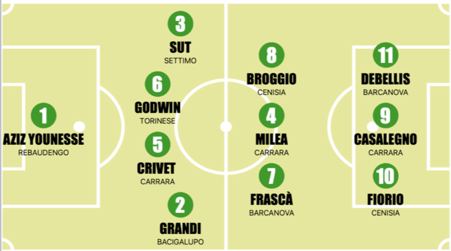 A pari merito per numero di clean sheet (4) con Rondilone e Chirieleison, portieri delle due capoliste, Carrara e Cenisia, la scelta ricade su di lui dati i 14 punti in meno ottenuti fin qui dal suo Rebaudengo. Arma in più della squadra, ha portato parecchi punti con le sue parate, in particolare nel match contro l’Academy Lascaris, dove è risultato determinante nel successo per 4-3.